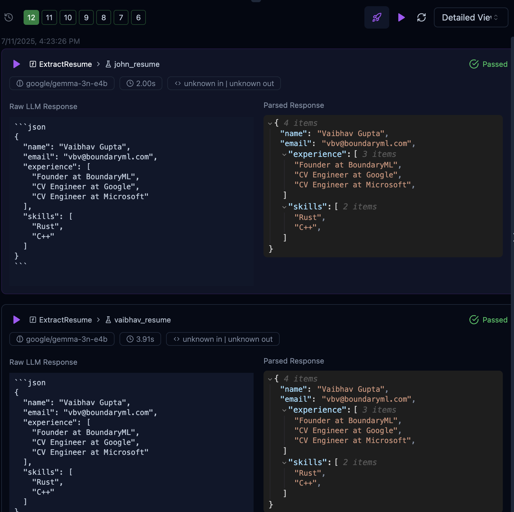 Click the numbers on the left to switch between test results.